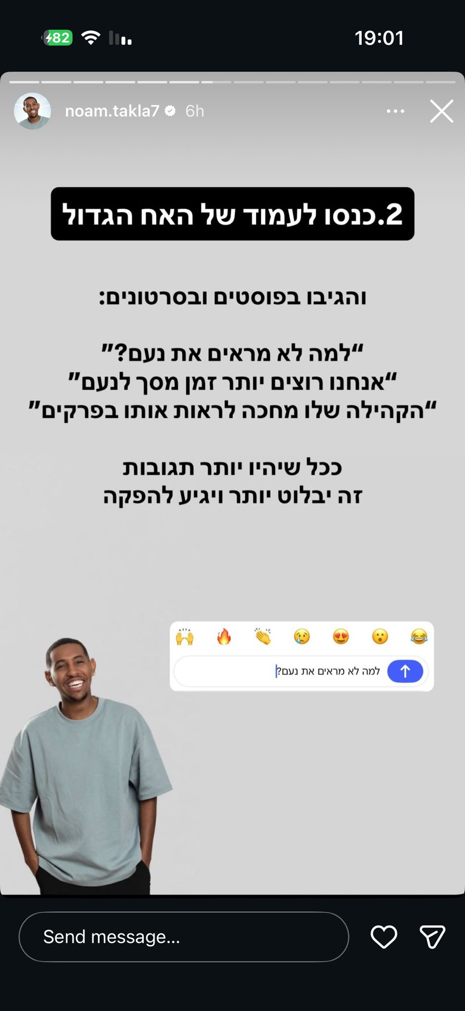 "2. כנסו לעמוד של 'האח הגדול' והגיבו בפוסטים ובסרטונים: 'למה לא מראים את נעם?', 'אנחנו רוצים יותר זמן מסך לנעם', 'הקהילה שלן מחכה לראות אותו בפרקים'". מטעמו הסבירו מדוע זה חשוב: "ככל שיהיו יותר תגובות, זה יבלוט יותר ויגיע להפקה".