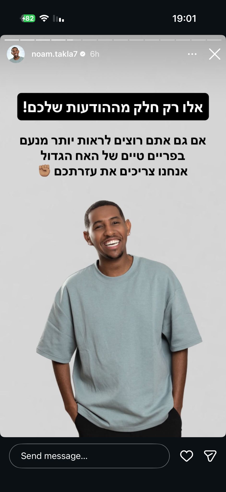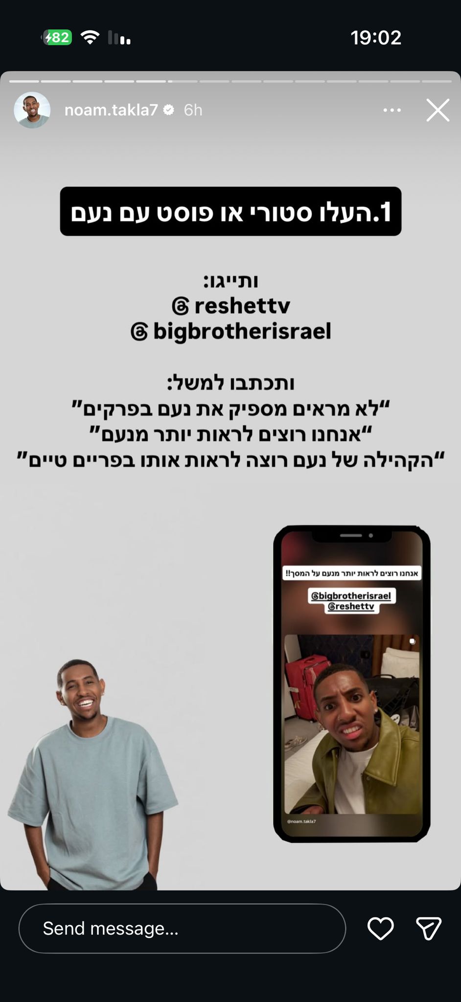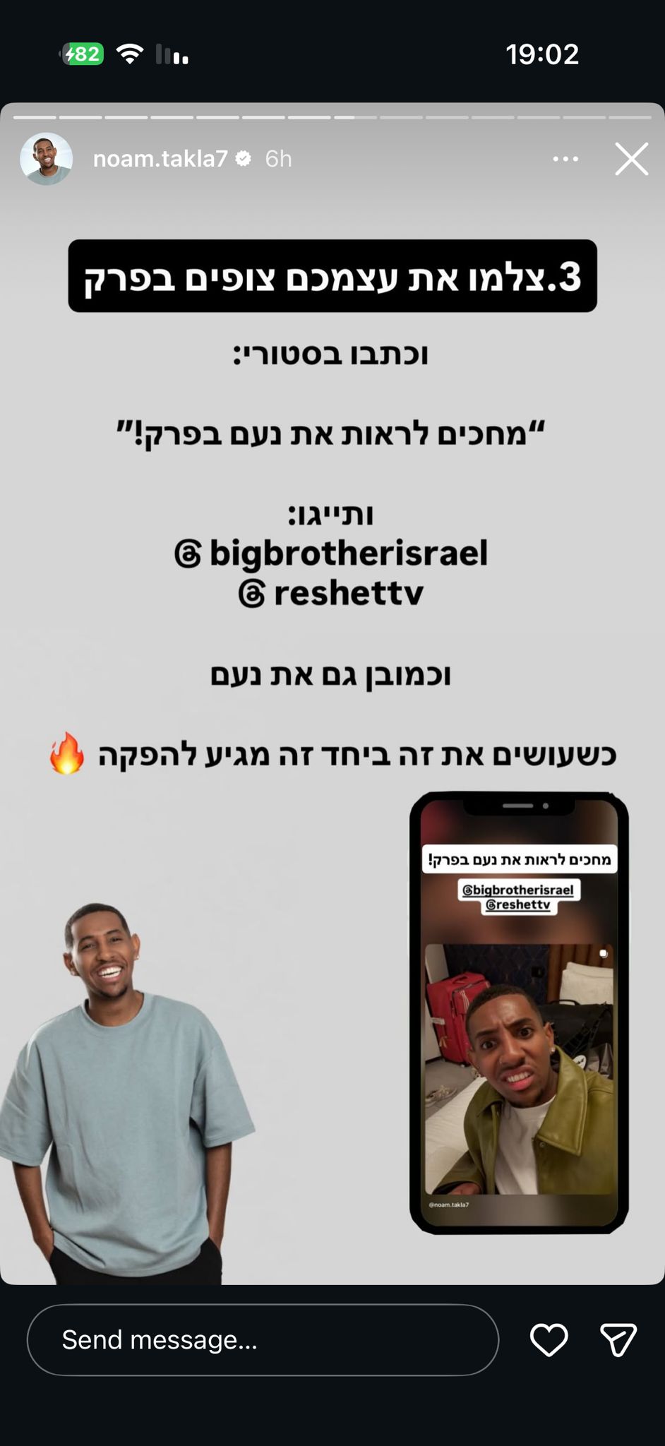 "3. צלמו את עצמם צופים בפרק וכתבו בסטורי: 'מחכים לראות את נעם בפרק!' ותייגו את עמודי האינסטגרם של 'האח הגדול ורשת 13 וכמובן גם את נעם". לסיום נכתב: "כשעושים את זה ביחד, זה מגיע להפקה".