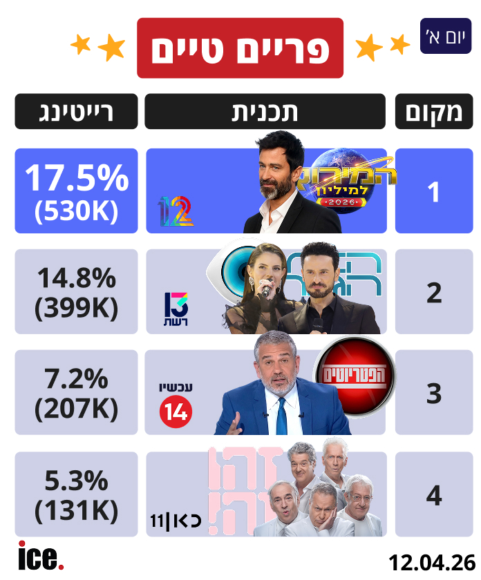 דירוג הרייטינג היומי של ice: פצצת הרייטינג של קשת 12, "המירוץ למיליון" רשמה ניצחון עם 17.5% ו-530 אלף צופים, "האח הגדול" הרחק מתחתיה עם 14.8% רייטינג ו-400 אלף צופים, כמה עשו "הפטריוטים"?