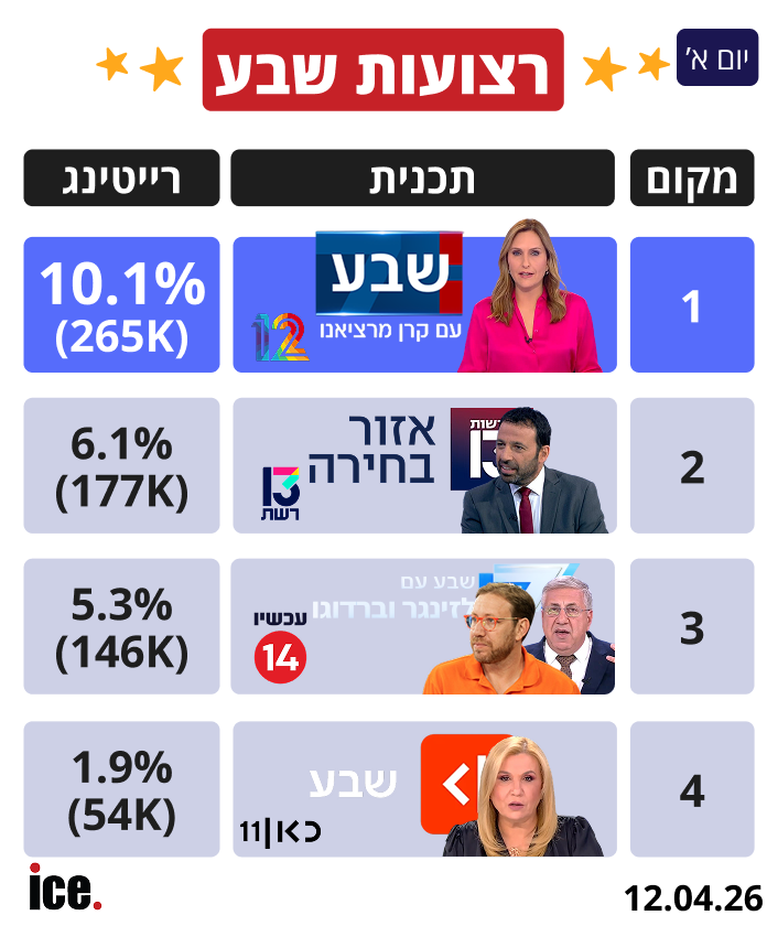 ברצועת 19:00, קשת 12 עם שבע עם קרן מרציאנו מובילה בפער עם 10.1% (265 אלף צופים). הרחק מאחור, במקום השני "אזור בחירה" עם רביב דרוקר ברשת 13 משיגה 6.1% (177 אלף צופים), כשבמקום השלישי התוכנית של שלזינגר וברדוגו בערוץ 14 עם 5.3% (146 אלף צופים). שבע עם ליאל קייזר ושאול אמסטרדמסקי בכאן 11 מסתפקת ב-1.9% בלבד (54 אלף צופים).