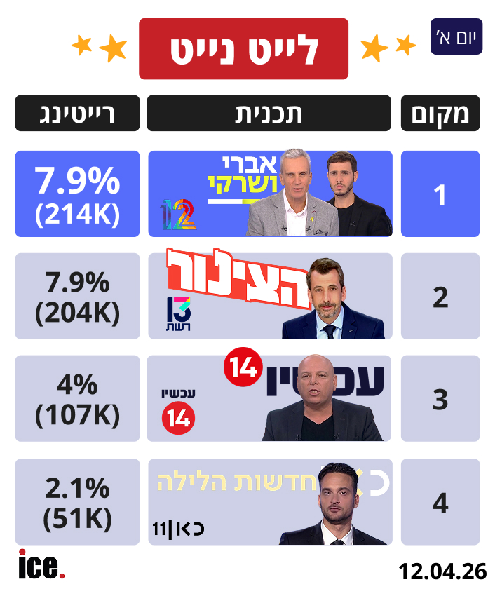 ברצועת הלייט נייט, "אברי ושרקי" בקשת 12 במקום הראשון עם 7.9% (214 אלף צופים), ובמקום השני גיא לרר ו-"הצינור", עם רייטינג זהה של 7.9% אך כמות צופים שונה (204 אלף צופים). חדשות הלילה עם אמיר איבגי, שסוגרת את הערב עם 4.0% (107 אלף צופים), ובמקום הרביעי חדשות הלילה של כאן 11 עם 2.1% רייטינג (51 אלף צופים).