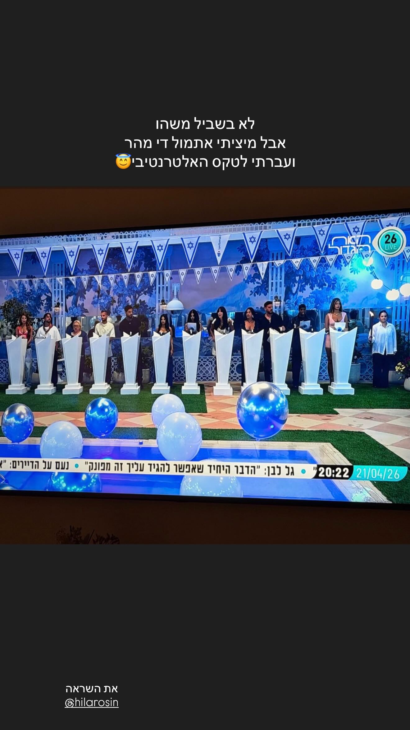 מגישת "האח הגדול", לירון ויצמן שיתפה כי נמאס לה לצפות בטקס המשואות המסורתי בהר הרצל ונטשה לטקס המשואות האלטרנטיבי של הדיירים בבית המדובר בנווה אילן ששודר בערוץ 26. "לא בשביל משהו אבל מציתי אתמול די מהר ועברתי לטקס האלטרנטיבי", כתבה בסטורי בחשבון האינסטגרם שלה.