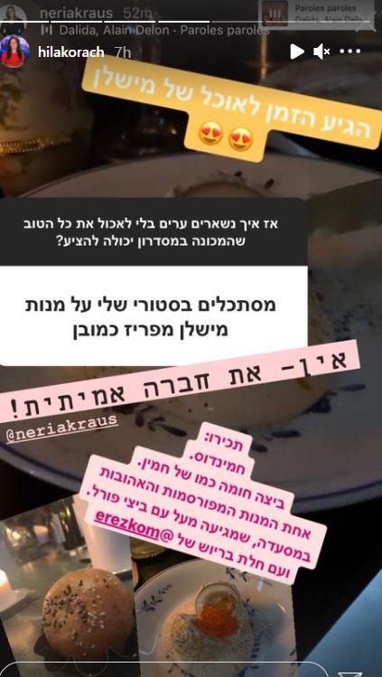 נריה קראוס חברתה לערוץ 13 וכתבת התרבות בערוץ הגיבה לה "מסתכלים בסטורי שלי על מנות מישלן מפריז כמובן", ועל התגובה הכואבת הזאת כתבה לה קורח, "אין - את חברת אמת". אז לא ברור כרגע מה בסוף עזר לקורח ששיתפה גם שנותרו לה עוד שמונה שעות של לילה לתורנות, אבל עכשיו היא כבר כנראה אחרי, מקווים שהתורנות עברה בטוב.