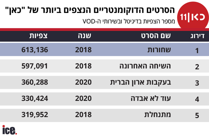 תאגיד השידור הישראלי חושף, לבקשת ice, את רשימת חמשת הסרטים הדוקומנטריים הנצפים ביותר שלו בערוצי הצפייה השונים