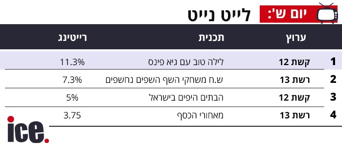 בלייט נייט, לילה טוב עם גיא פינס בקשת 12 ניצחה בפער ניכר עם 11.3% את השידור החוזר למשחקי השף 'השפים נחשפים' שגרף 7.3% בסך הכל, הבתים היפים בישראל בקשת עם 5% לעומת מאחורי הכסף ברשת 13 שרשם 3.7%.