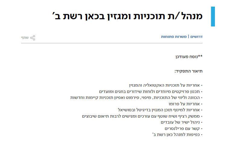 בתאגיד השידור הציבורי פורסם מכרז למנהל תוכניות ומגזין בכאן רשת ב', שעל פי חלק מהדרישות היה בו, לכאורה, הפליה לציבור שומרי השבת והמגזר הדתי לפי שנדרש מהמועמדים למלא את מקום המנהל של כאן רשת ב' בתורנות בסופי שבוע וכי נדרשה נכונות לעבודה סביב השעון כולל סופי שבוע.