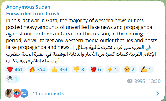 ההאקרים הודיעו כי "במלחמה האחרונה בעזה, כלי החדשות המערביים הרבו בפירסום של חדשות מזויפות ותעמולה לא מאומתות נגד אחינו בעזה".בהתאם טוען גוף התקיפה אנונימוס סודן כי יתקוף "כל כלי תקשורת מערבי שמשקר ומפרסם תעמולה וחדשות כוזבות".